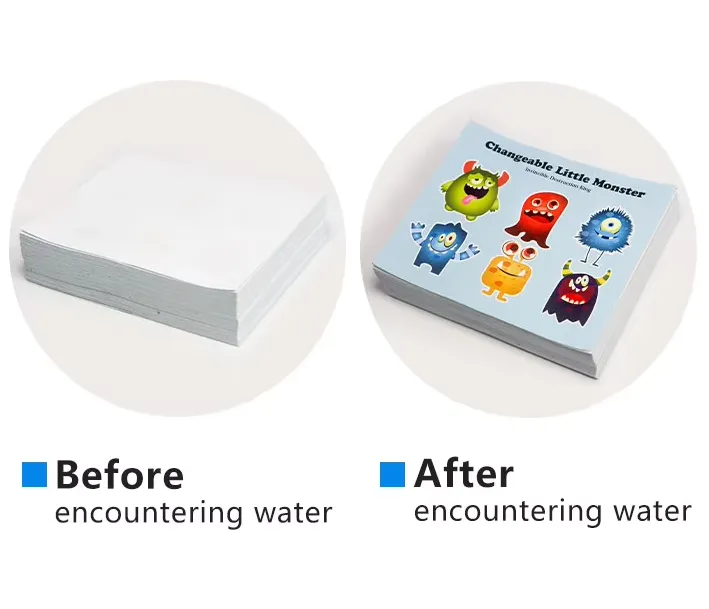 Мало прскање вода е сè што е потребно за да се активира одговорот на етикетата. Мала тежина и пренослива, етикетите може да се направат во различни форми како што се картички и инстант отпечатоци во стил на фотографии.JOJO пакетобезбедува услуги за прилагодување, можеме да печатиме цртани шеми, логоа на брендови, промотивни содржини и повеќе на етикетите. Тие се идеални за празнични честитки, детски едукативни играчки, бренд маркетинг, против фалсификување и други апликации.