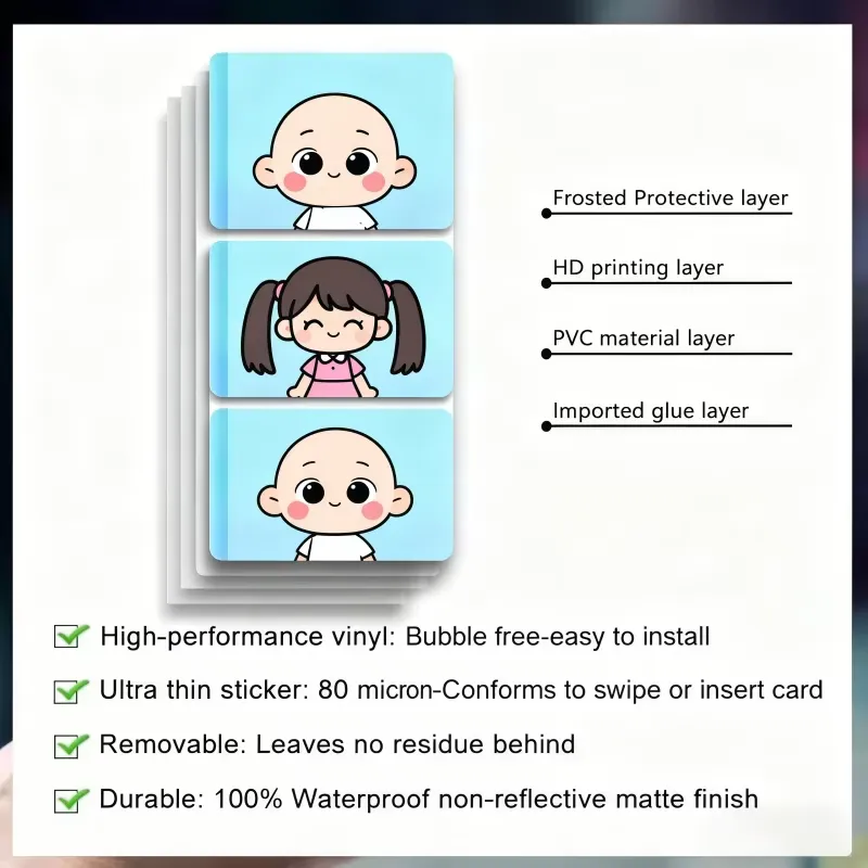 Налепници за покривање на кредитна картичкасе украсни и заштитни налепници дизајнирани да се нанесуваат на површината на кредитните картички. Тие се погодни и за други картички со слична големина како што се дебитни картички, транспортни картички и клуч картички.