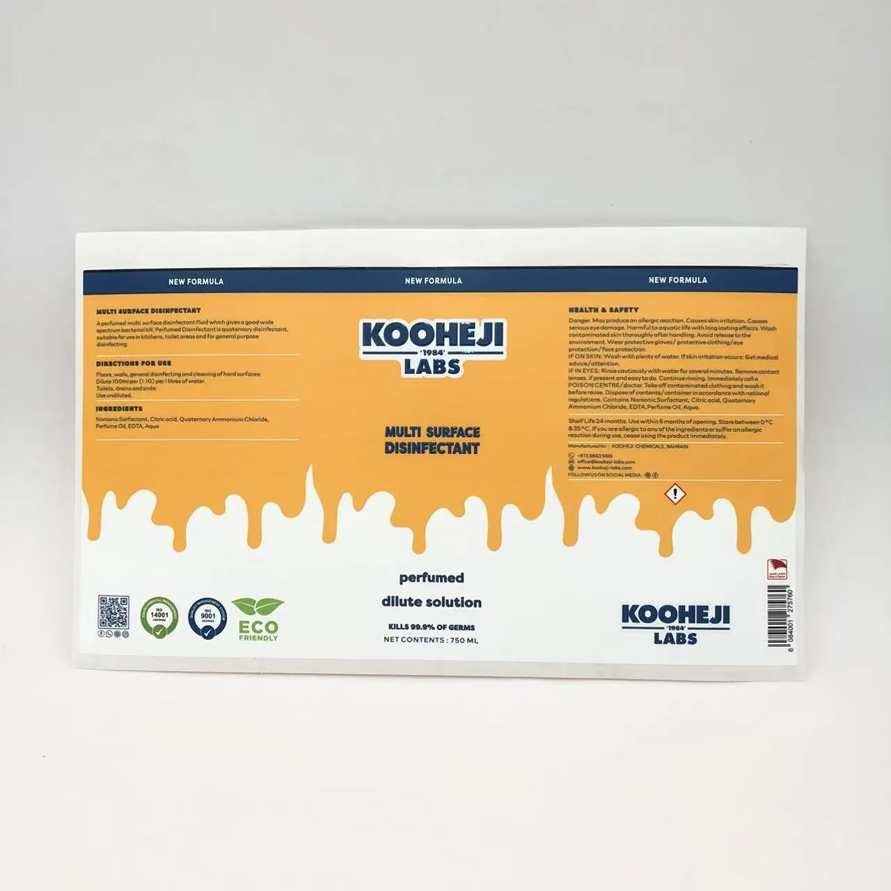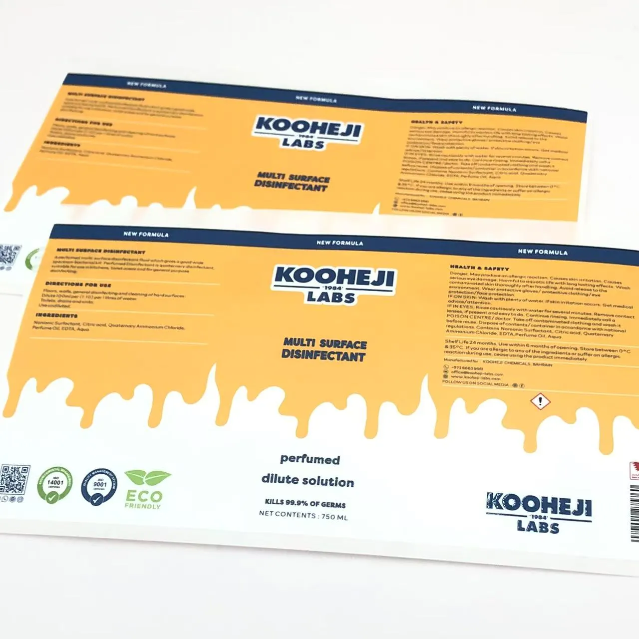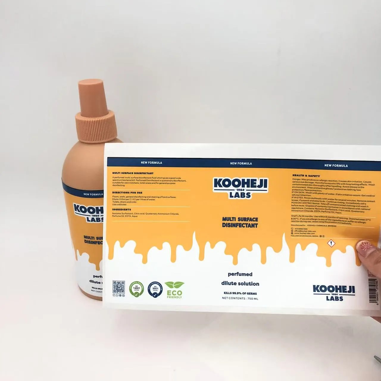 JOJO пакетдлабоко се занимава со прилагодување на етикетите за пакување шишиња за дезинфекција, запознаени сме со барањата за материјали и безбедносните стандарди на производите за дезинфекција во медицинските, домаќинствата, комерцијалните и индустриските области, обезбедувајќи приспособените етикети целосно да се прилагодат на суровите средини за употреба.