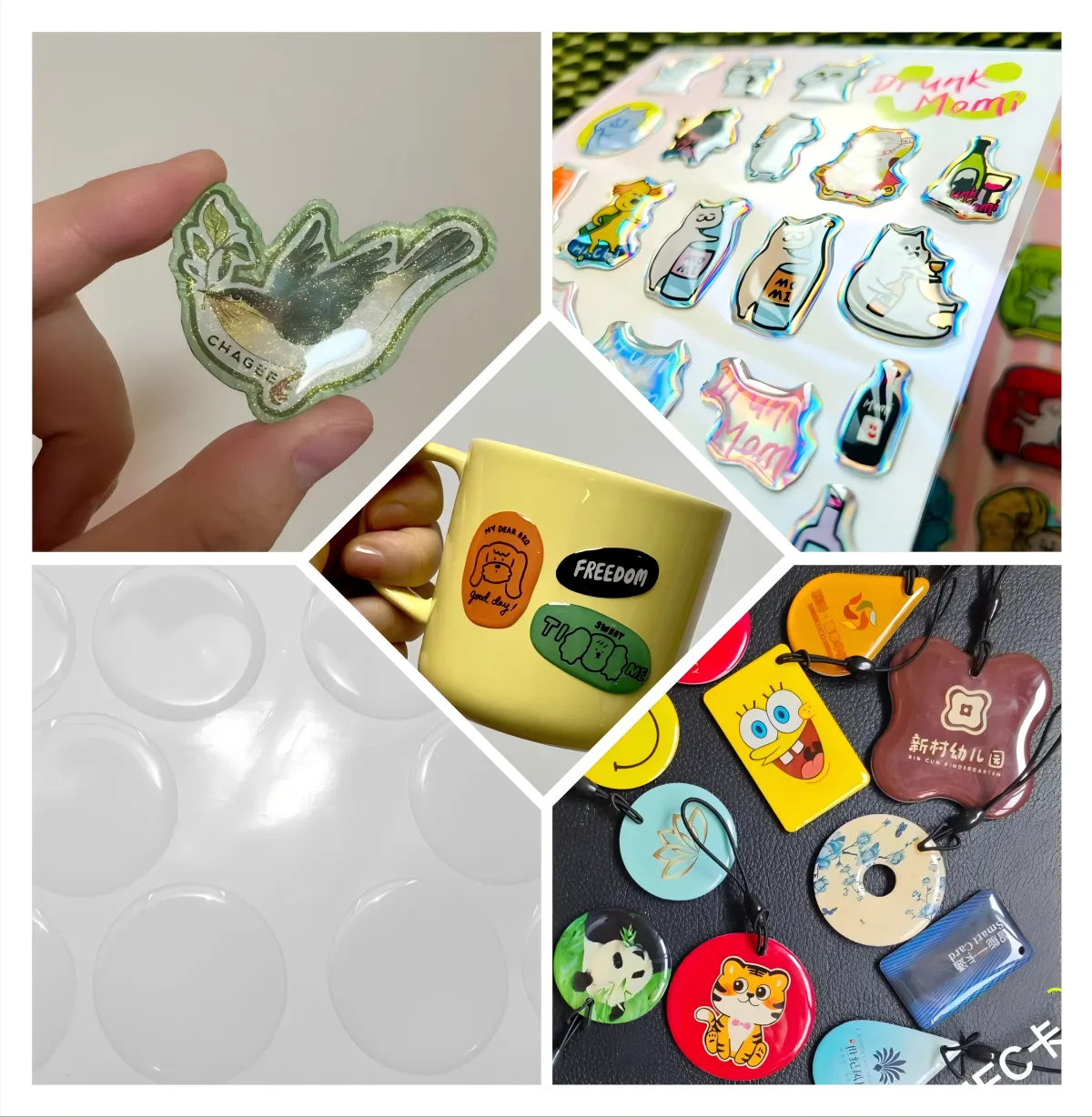 А3: Налепниците од епоксидна смола се широко користени во индустрии како што се логоа на брендови за електронски производи, предупредувачки етикети за индустриска опрема, украсни налепници за автомобилски делови, персонализирани налепници за подароци и етикети за идентификација за медицински уреди.
