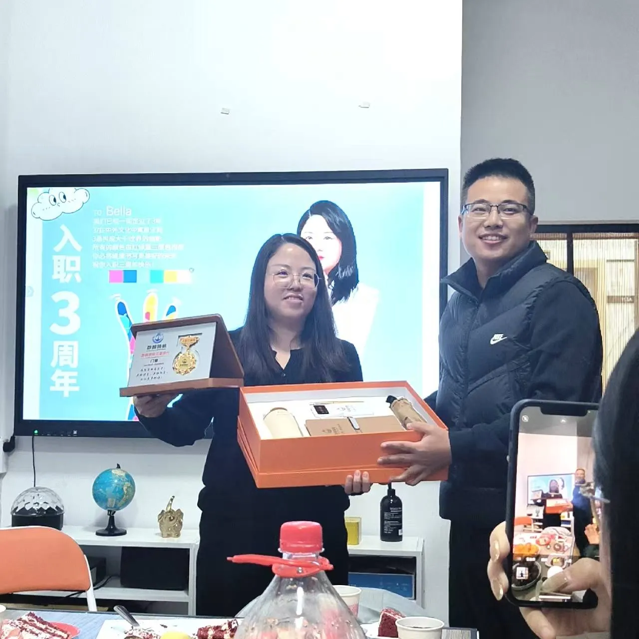 Како прекрасно изненадување, шефот Гао лично им подари прекрасни подароци за годишнината од работата на Том и Ела и менаџерот Бела. Овие специјални токени се искрено признание за нивниот придонес во изминатите години и ги носат нашите најдобри желби за нивниот континуиран раст со компанијата.