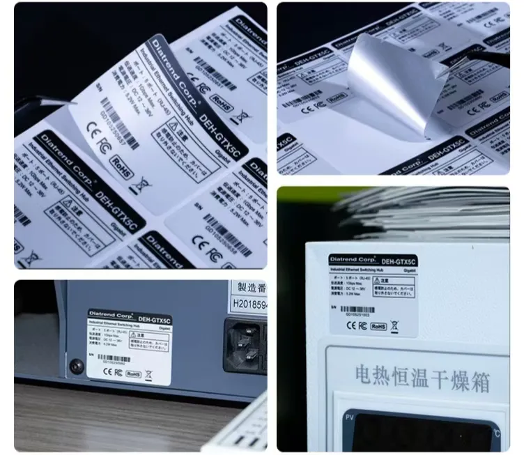 ПЕТ бело/мат сребро: Отпорен на топлина до 150℃, погоден за таблички со имиња на домашни апарати и адаптери за напојување.