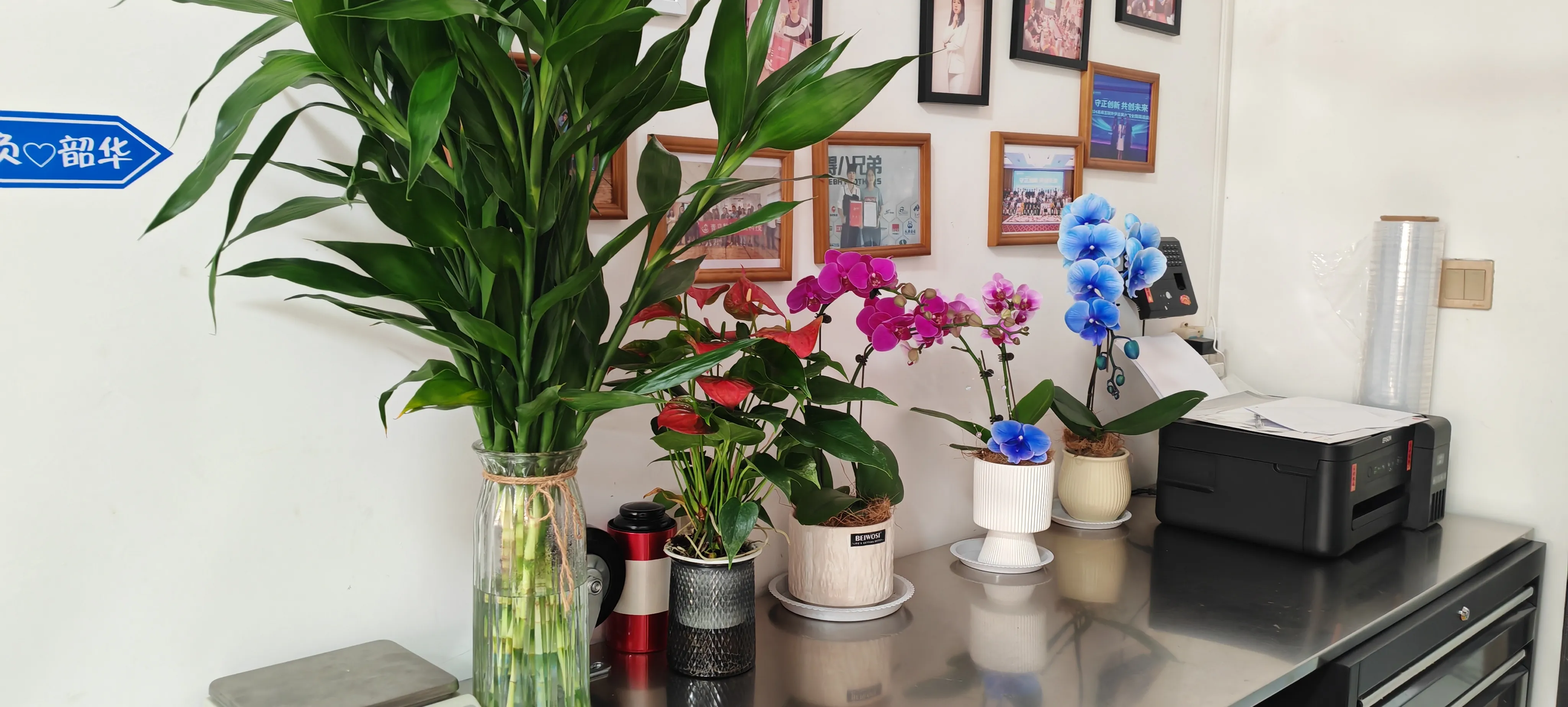 Влезете воJOJO Pack'sканцеларија. На двете страни на рецепцијата има три саксии со phalaenopsis. Нивните лисја се раширени и прави, исто како пеперутките што ќе одлетаат. Тие додаваат допир на елеганција и грациозност на компанијата. Зелената dracaena sanderiana ја избрка досадноста на деловниот простор. Многу вработени се привлечени од промените овде штом ќе пристигнат во компанијата. Застануваат да уживаат и да се фотографираат со своите мобилни телефони.