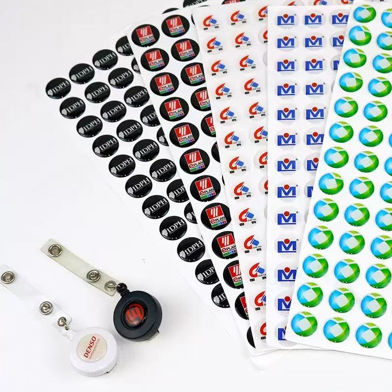 Во однос на формата: Покрај тркалезната форма, етикетите со тркалезни епоксии можат да се прилагодат и во други форми како што се овални, правоаголник и квадрат. Покрај тоа, може да се отпечати и со различни обрасци, текстови, логоа, итн. Преку печатење на свилен екран, офсет печатење, дигитално печатење и други процеси за да се задоволат различни персонализирани потреби.