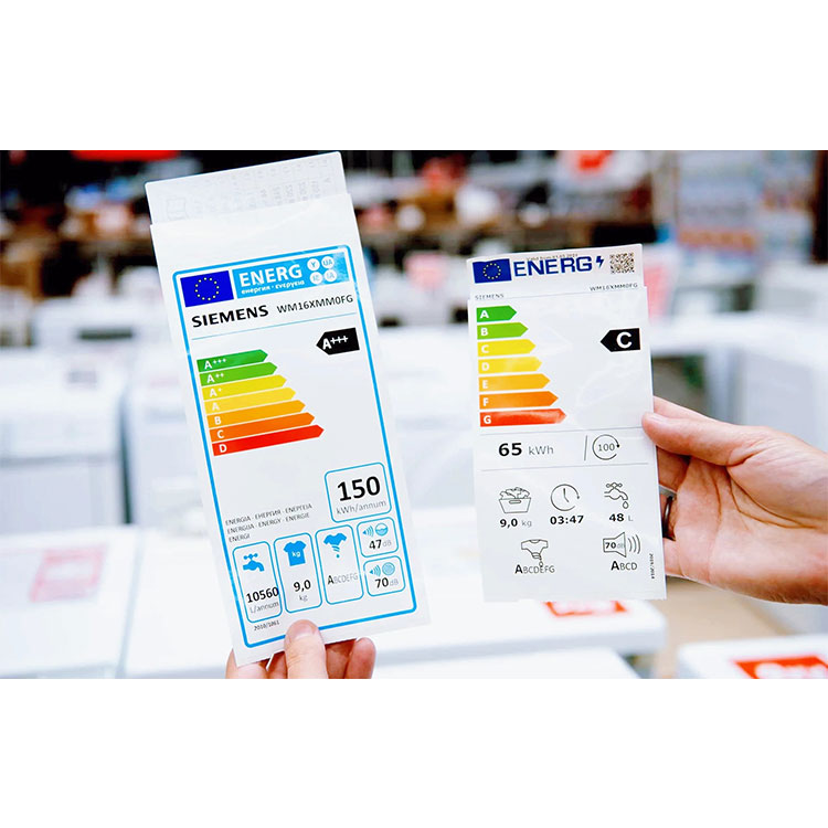 Ознака за енергетска ефикасност на машината за перењее стандардизирана етикета, обично изработена од издржлив, водоотпорен материјал со јасен визуелен дизајн. Ветикети за енергетска ефикасност на машината за пепелобично се со големина 200 x 300 mm и лесно се препознаваат на машините за перење. Ветикети за енергетска ефикасност на машината за пепелима отпечатен рејтинг за енергетска ефикасност, вообичаено претставен со буквите A+++ до G, и е кодиран во боја за брза идентификација.