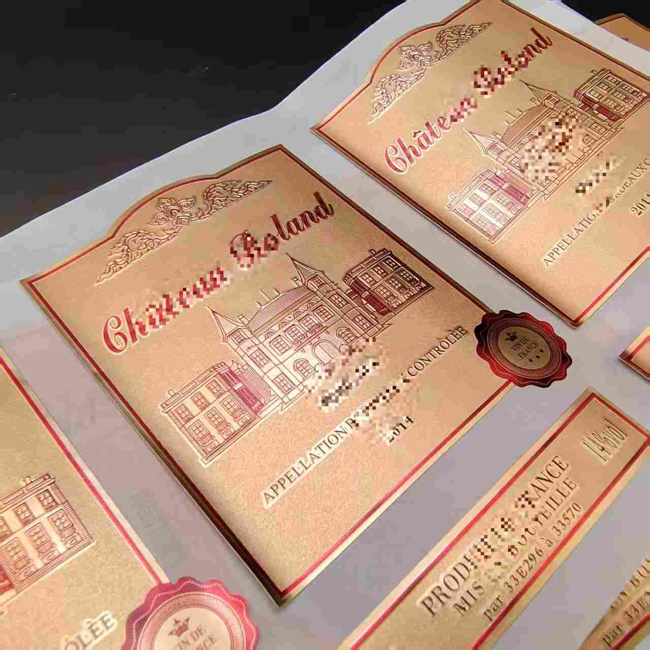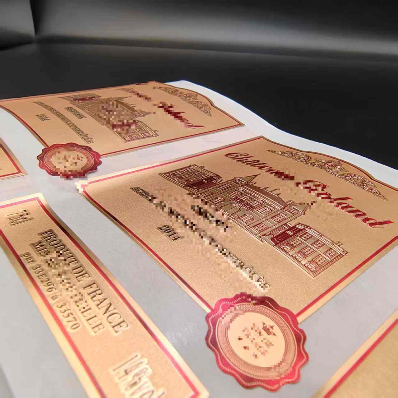 Налепниците за шишиња за вино се направени од висококвалитетен ПВЦ материјал, прилагодените водоотпорни ПВЦ етикети за позлатено вино имаат одлична отпорност на вода и влага.